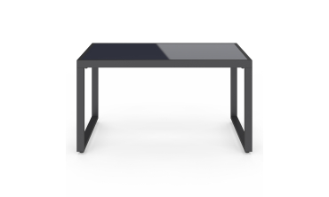 Matériaux : Structure en acier, coussins en polyester 180 gr/m², plateau de table en verre teinté