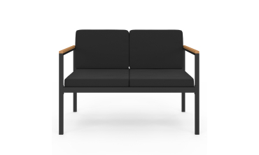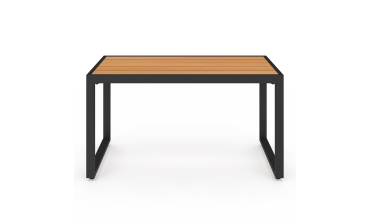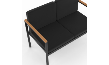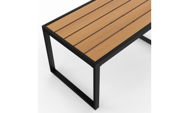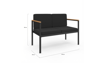 Matériaux : Structure en acier, accoudoirs en polywood, coussins en polyester 180 gr/m², plateau de table en polywood